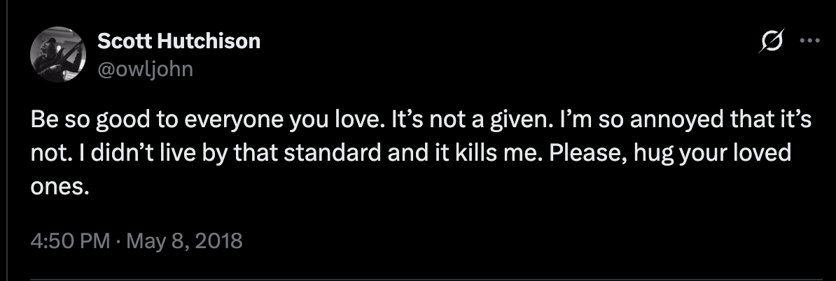I think about Scott Hutchinson’s final tweets a lot. Perhaps more often than I should. They aren’t difficult to find—I have screenshots of them, of course, but his final words, from May 8th, 2018, are still right there, online. His Twitter account, inactive for the last eight years, hasn’t been deleted. His final words haunting. And hanging like a specter. A reminder.